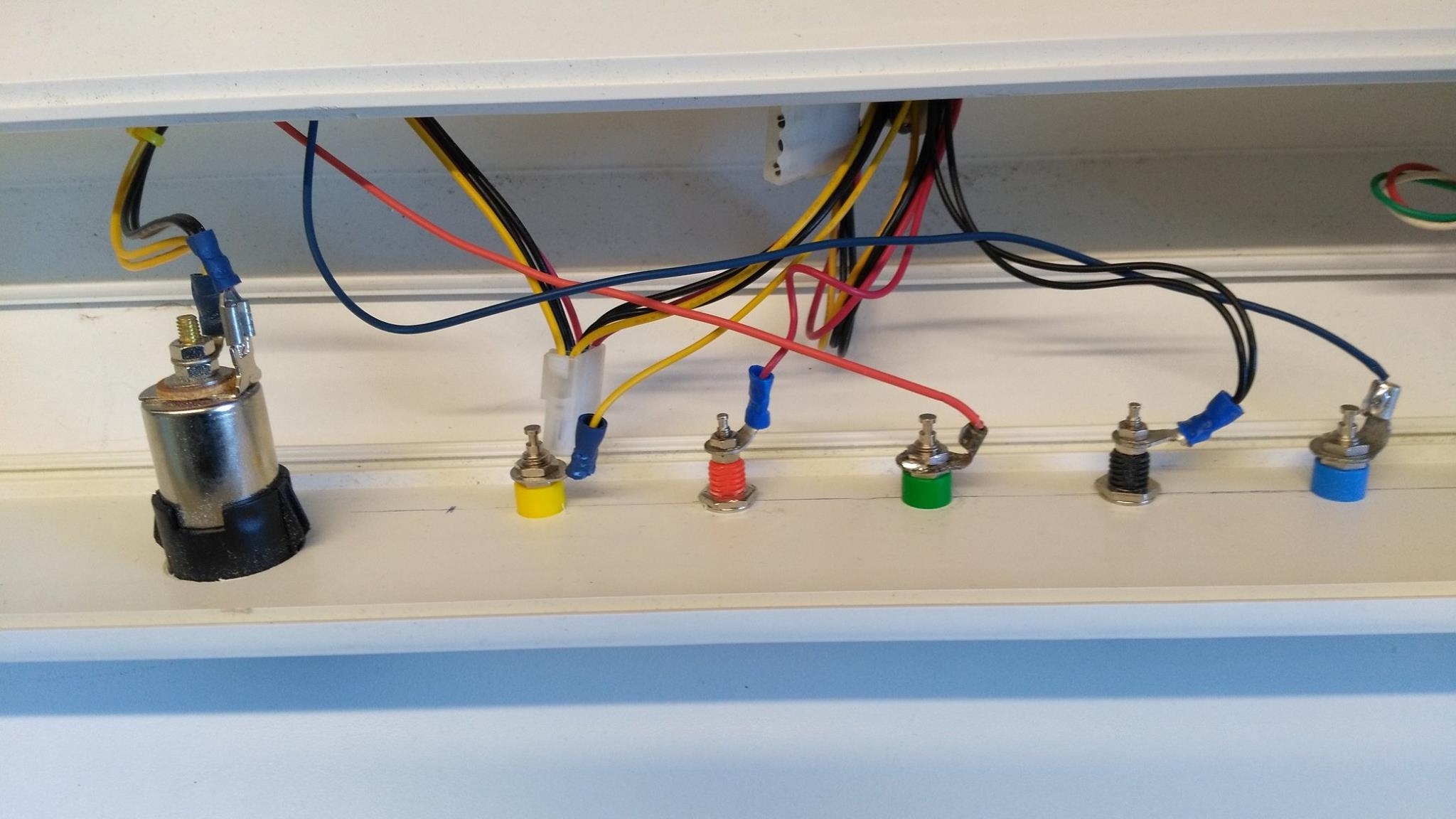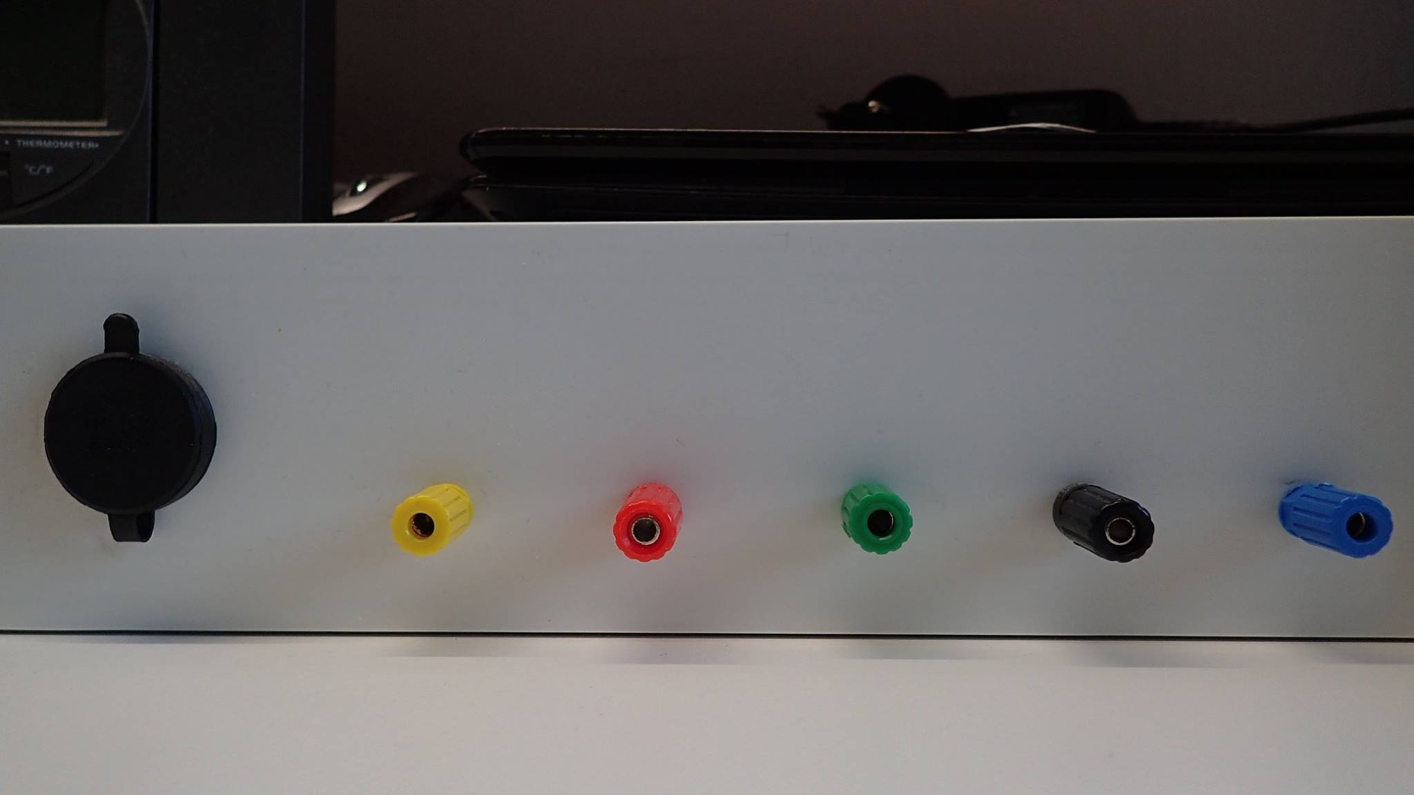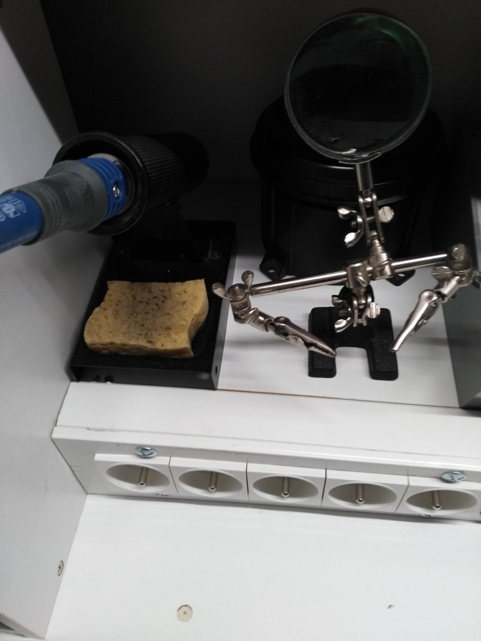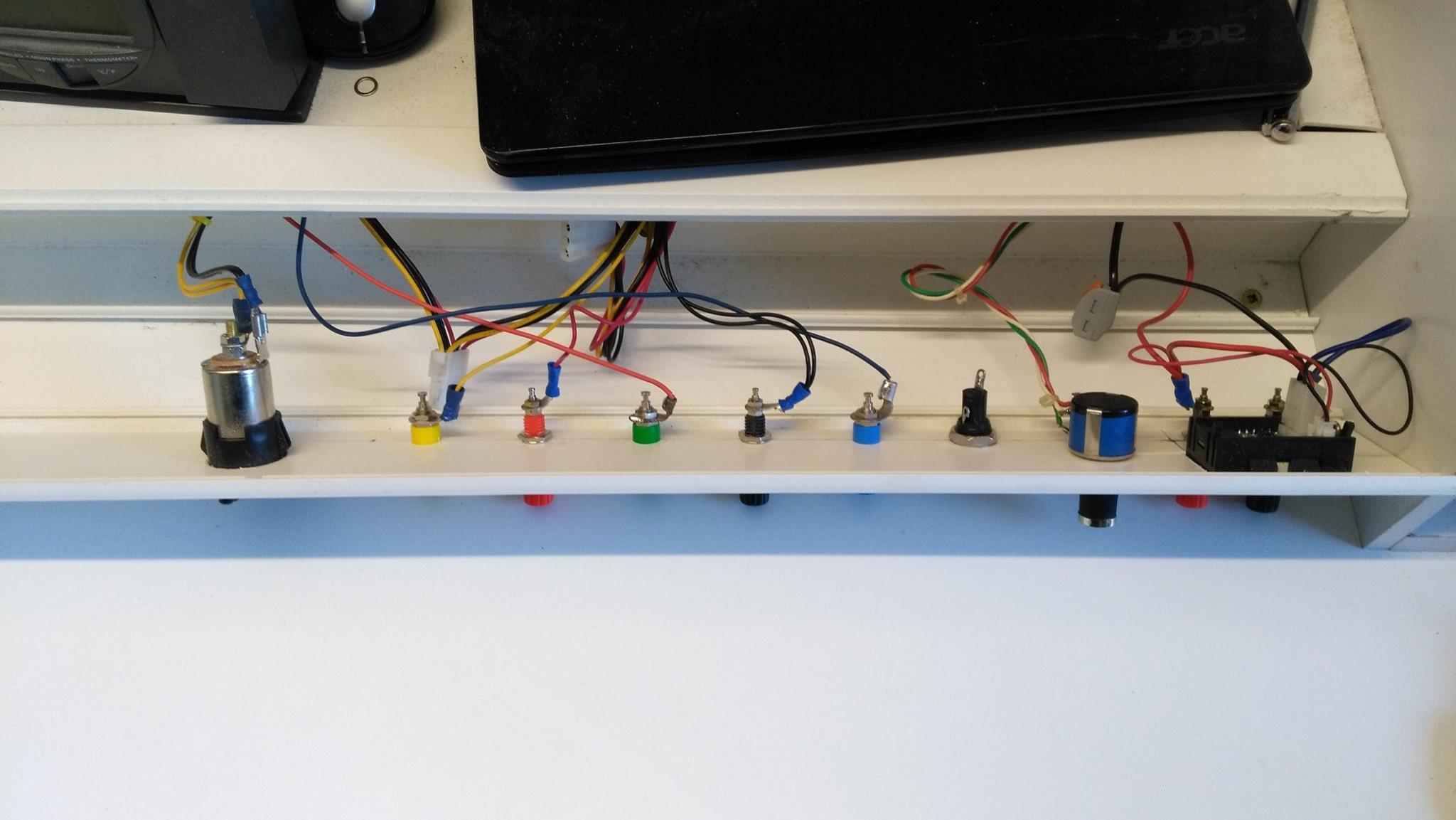Vue d’ensemble de l’intérieur de la goulotteL’intérieur côté alimentation secteur : 5 prises 2P+T et un voltmètre/Ampèremètre/Wattmètre/Wh. On remarque le tore sur la phase permettant la mesure de l’intensité par inductionVue extérieure de la partie alimentation secteurGros plan sur l’instrument de mesure basse tension alternativeMesure avec une charge, en l’occurrence mon fer à souderVue d’ensemble intérieure côté alimentations continuesDe gauche à droite : une prise allume-cigare 12V et les prises +12V, +5V, +3,3V, 0V et -12V pour le coin laboVue globale du banc une fois terminéVue extérieure de la partie alimentation continue allume-cigare +12V, +12V, +5V, +3,3V, 0V et -12VL’alimentation variable 3-30V 5A avec de gauche à droite : le porte-fusible, le potentiomètre le voltmètre-ampèremètre et au dessus les prises + et –Vue globale de l’alimentation variable 3-30V 5AGros plan sur l’instrument de mesure très basse tensionLe banc de développement Arduino et RaspBerry PiL’interface oscilloscope double voie et analyseur logique à 16 canauxLe logiciel oscilloscope/analyseur logiqueL’outil de diagnostic analogique/numériqueUne partie de l’outillage de soudureLe testeur de composants passifsLe travail une fois terminé